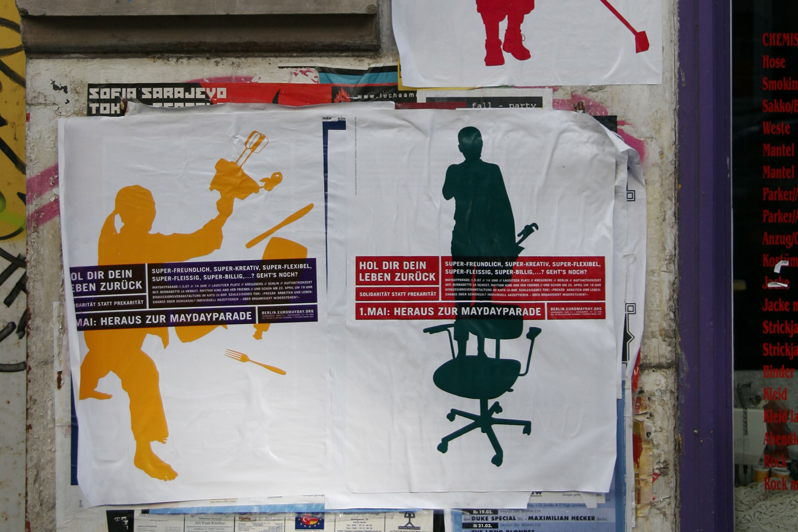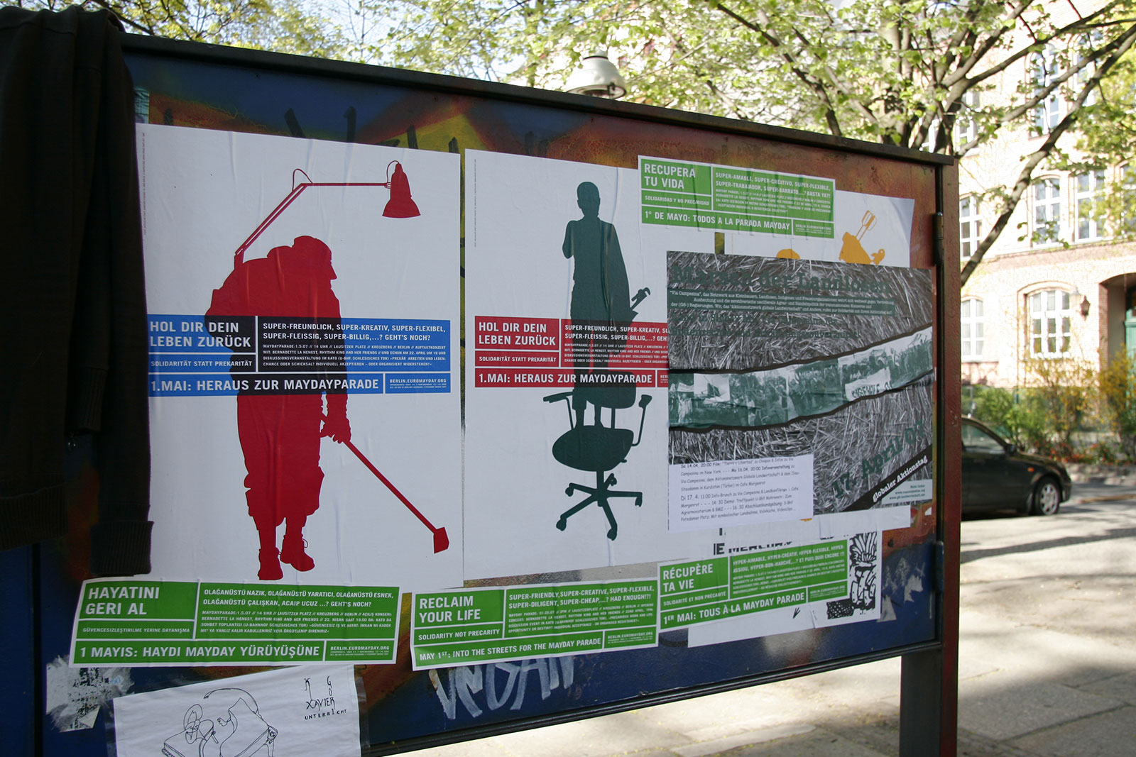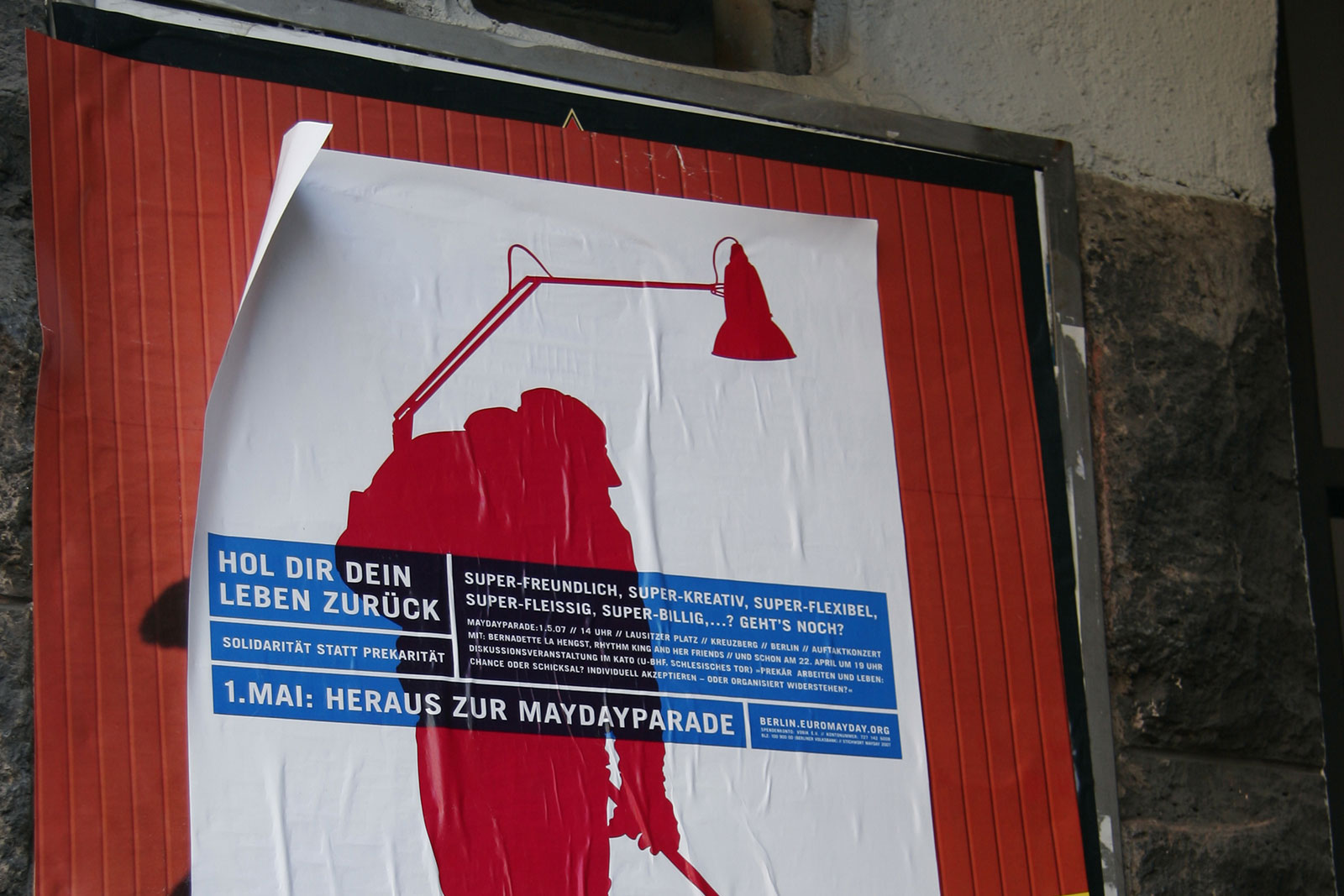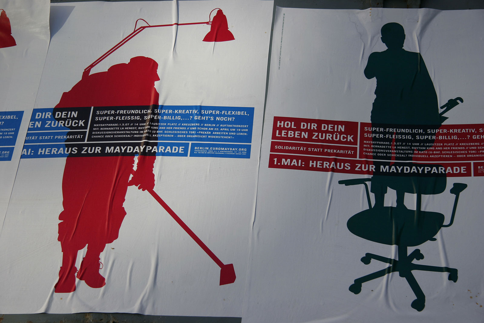 “What does International Workers’ Day mean for the self-employed — for the designer or any other highly flexible working person today? Or someone unemployed? How does someone self-employed go on strike? How do you fight for better working conditions?” Once a celebration of Spring and a commemoration of attacks on workers, EuroMayDay is a modern reinvention of the May Day tradition. The first MayDay Parade was held in Milan in 2001 and has since spread across Europe. In 2006, it grew into EuroMayday, a day of protests and actions to fight “precarization” of workers and discrimination against migrants in Europe and beyond. New forms of Precarity are a result of shifts in the modern workplace from permanent employment to temp work, freelance, and other instruments of “flexible labor.” This has resulted in an existence for workers without predictability or security, affecting both material and psychological welfare. In 2007 Mayday Berlin, a coalition of about 20 activist groups, organized the 2nd Euromayday demonstration in Berlin (as well as various events) in coordination with other Euromayday coalition in Europe (Paris, Milan, Hamburg, Brussels, …) under the claim « Take back your life! »