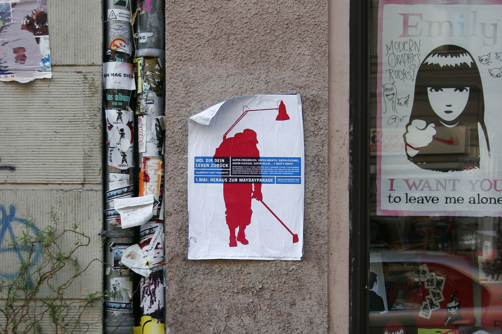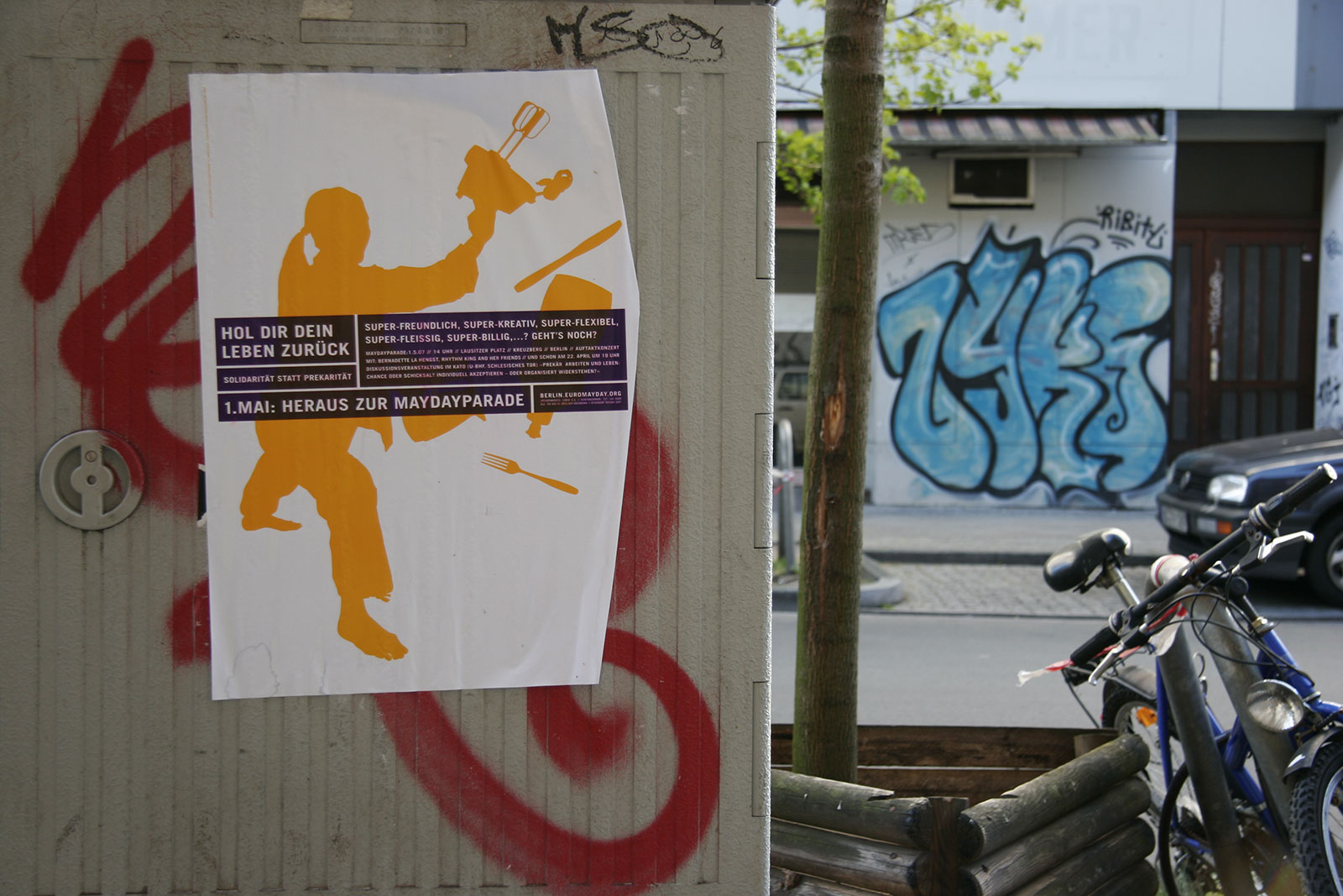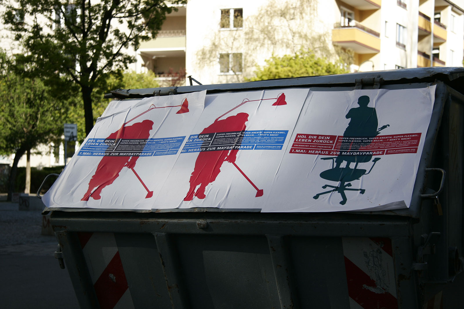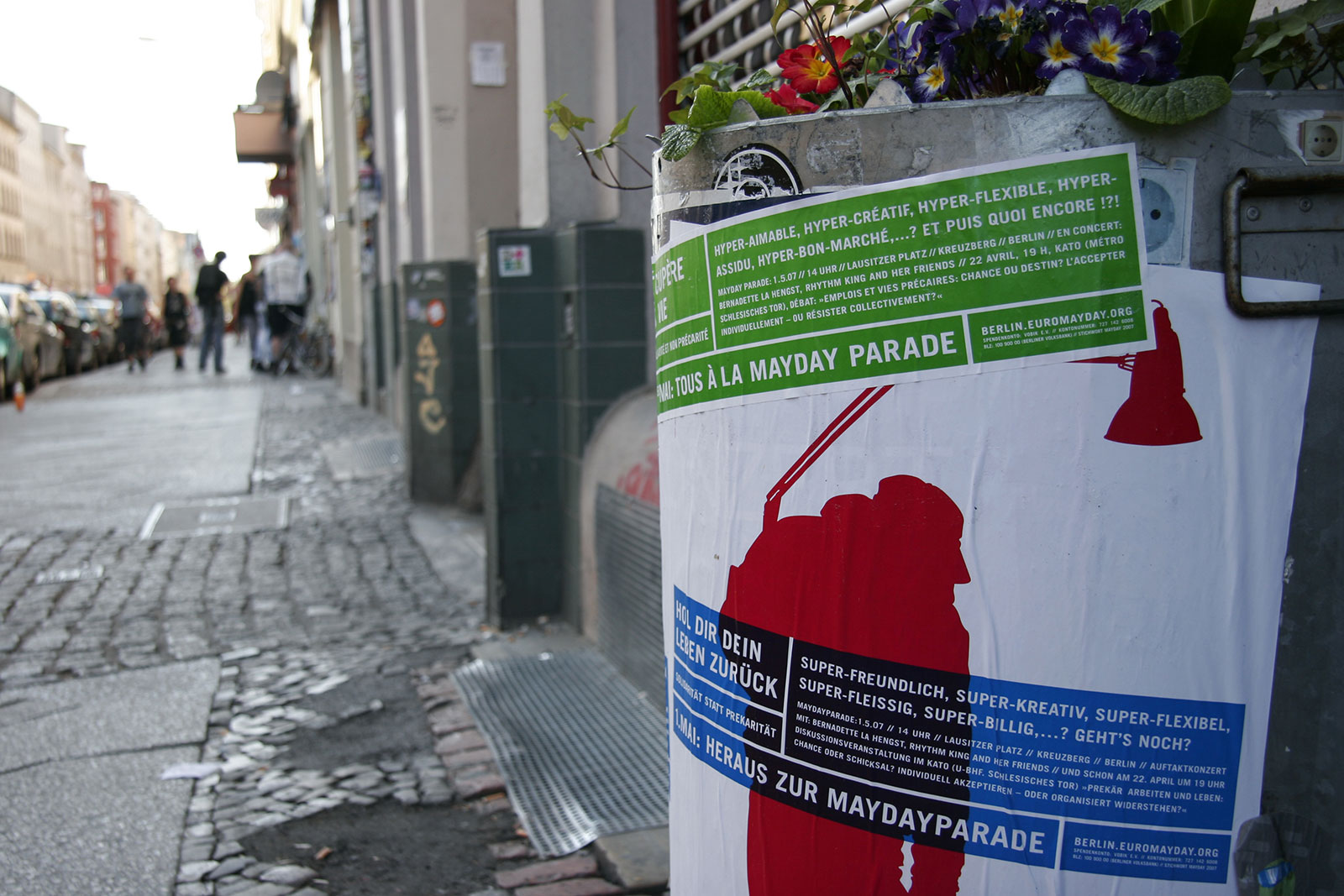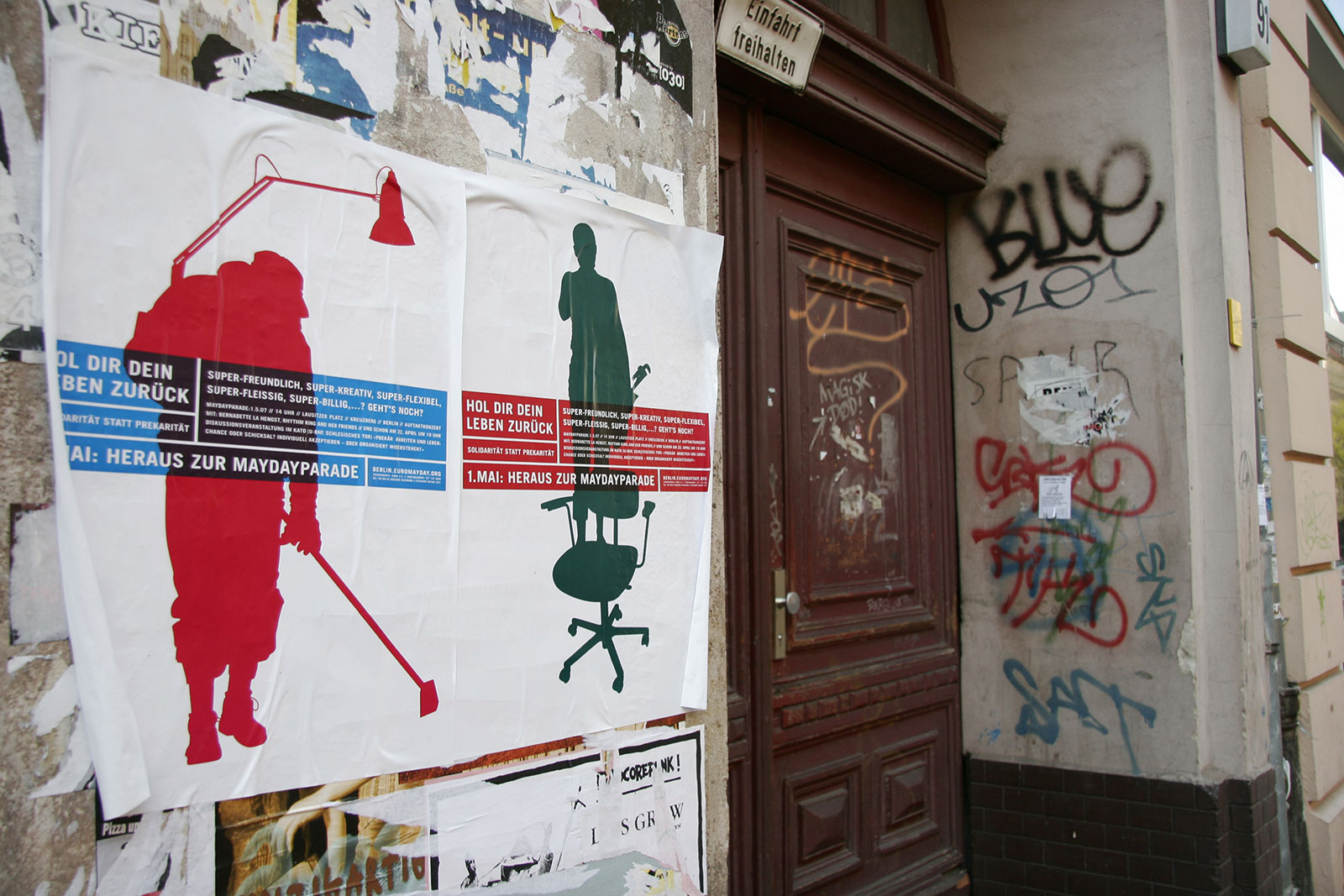“What does International Workers’ Day mean for the self-employed — for the designer or any other highly flexible working person today? Or someone unemployed? How does someone self-employed go on strike? How do you fight for better working conditions?” Once a celebration of Spring and a commemoration of attacks on workers, EuroMayDay is a modern reinvention of the May Day tradition. The first MayDay Parade was held in Milan in 2001 and has since spread across Europe. In 2006, it grew into EuroMayday, a day of protests and actions to fight “precarization” of workers and discrimination against migrants in Europe and beyond. New forms of Precarity are a result of shifts in the modern workplace from permanent employment to temp work, freelance, and other instruments of “flexible labor.” This has resulted in an existence for workers without predictability or security, affecting both material and psychological welfare. In 2007 Mayday Berlin, a coalition of about 20 activist groups, organized the 2nd Euromayday demonstration in Berlin (as well as various events) in coordination with other Euromayday coalition in Europe (Paris, Milan, Hamburg, Brussels, …) under the claim « Take back your life! »