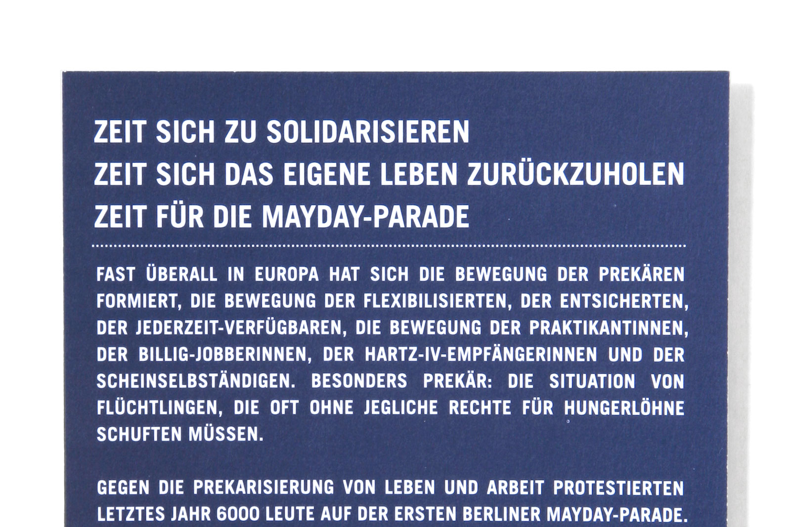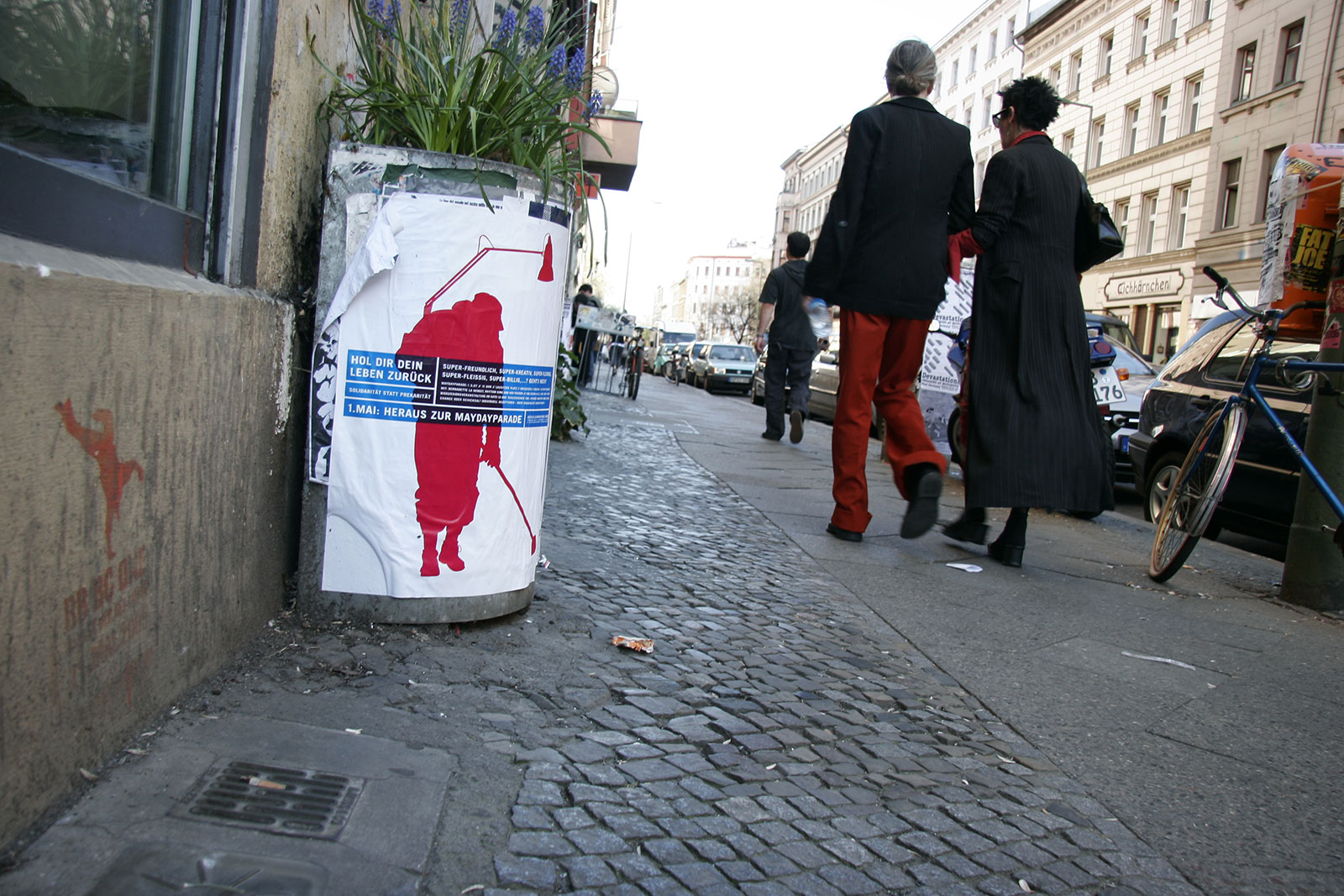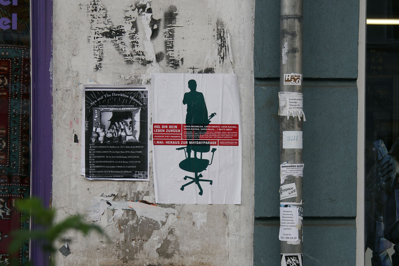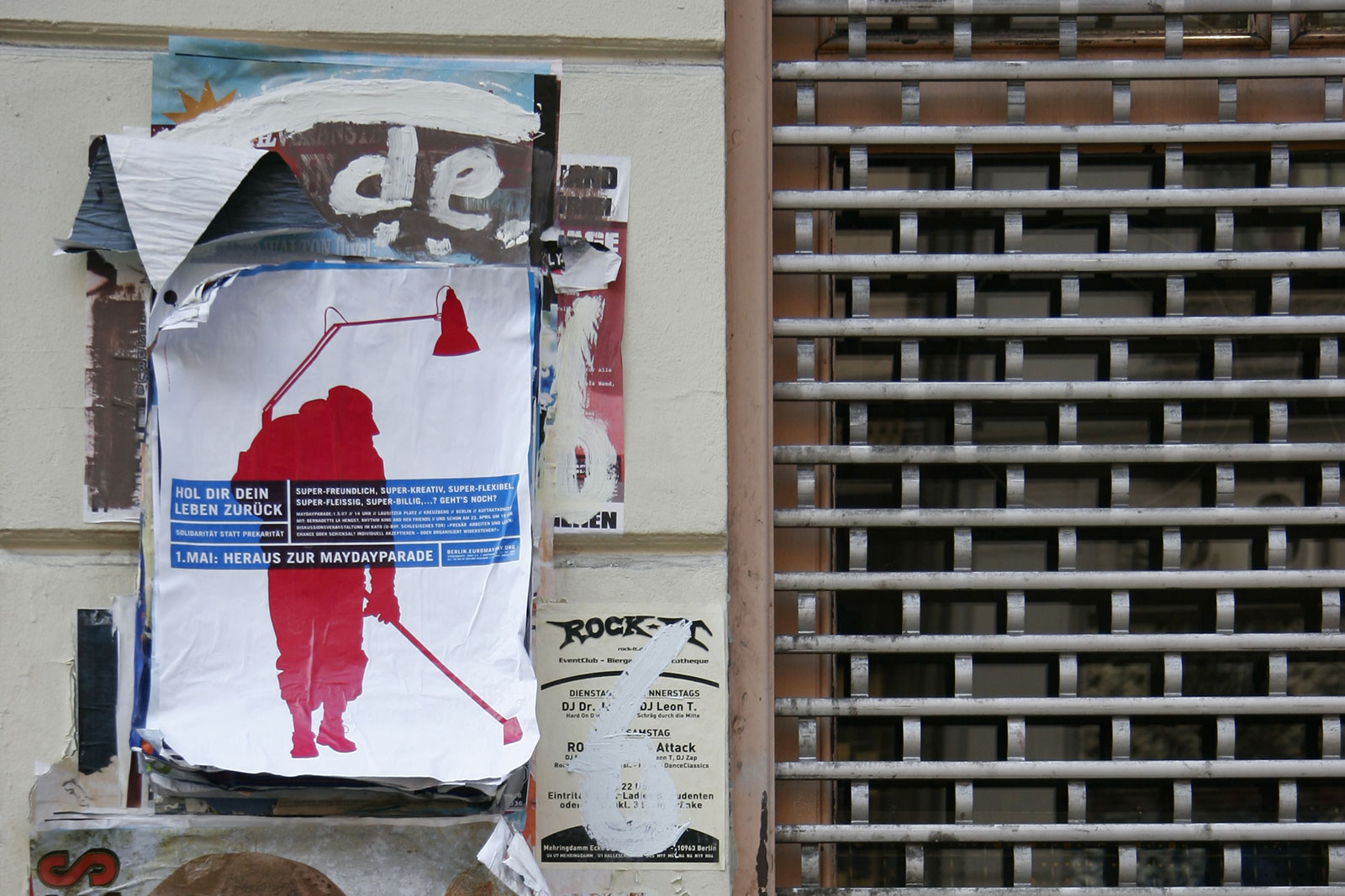 “What does International Workers’ Day mean for the self-employed — for the designer or any other highly flexible working person today? Or someone unemployed? How does someone self-employed go on strike? How do you fight for better working conditions?” Once a celebration of Spring and a commemoration of attacks on workers, EuroMayDay is a modern reinvention of the May Day tradition. The first MayDay Parade was held in Milan in 2001 and has since spread across Europe. In 2006, it grew into EuroMayday, a day of protests and actions to fight “precarization” of workers and discrimination against migrants in Europe and beyond. New forms of Precarity are a result of shifts in the modern workplace from permanent employment to temp work, freelance, and other instruments of “flexible labor.” This has resulted in an existence for workers without predictability or security, affecting both material and psychological welfare. In 2007 Mayday Berlin, a coalition of about 20 activist groups, organized the 2nd Euromayday demonstration in Berlin (as well as various events) in coordination with other Euromayday coalition in Europe (Paris, Milan, Hamburg, Brussels, …) under the claim « Take back your life! »